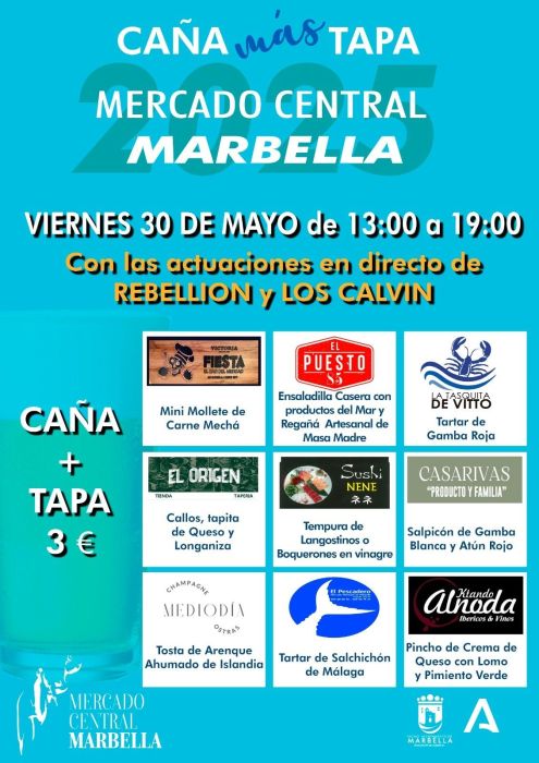 Marbella Central Market will host the ‘Beer Plus Tapas’ event this Friday from 1:00 PM to 7:00 PM, with nine establishments offering drinks and tapas for 3 euros each. The event, organized by the Municipal Commerce Department as part of the Andalusian Tourism Plan for Major Cities, aims to promote the market’s diverse gastronomic offerings based on fresh and quality products. Participating vendors include Mediodía, El Pescadero, Bar Fiesta, El Nene, Taberna Casa Rivas, Origen, El Puesto 85, Katando, and Tasca de Vitto, who will each provide a culinary creation paired with drinks, accompanied by live performances by the bands Rebellion and Los Calvin.