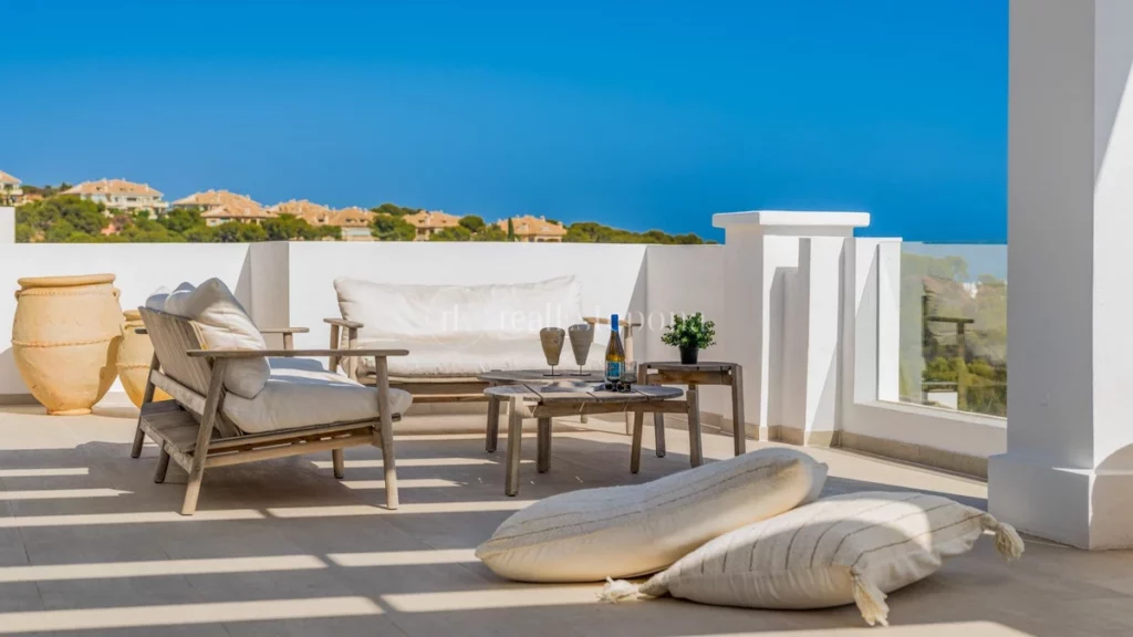 Located on a hill with exceptional views, it’s just a short drive from Puerto Banús and Marbella’s city center. The penthouse blends Mediterranean charm with modern design, offering an open-plan layout and large windows that connect the bright interiors to the spacious terraces.