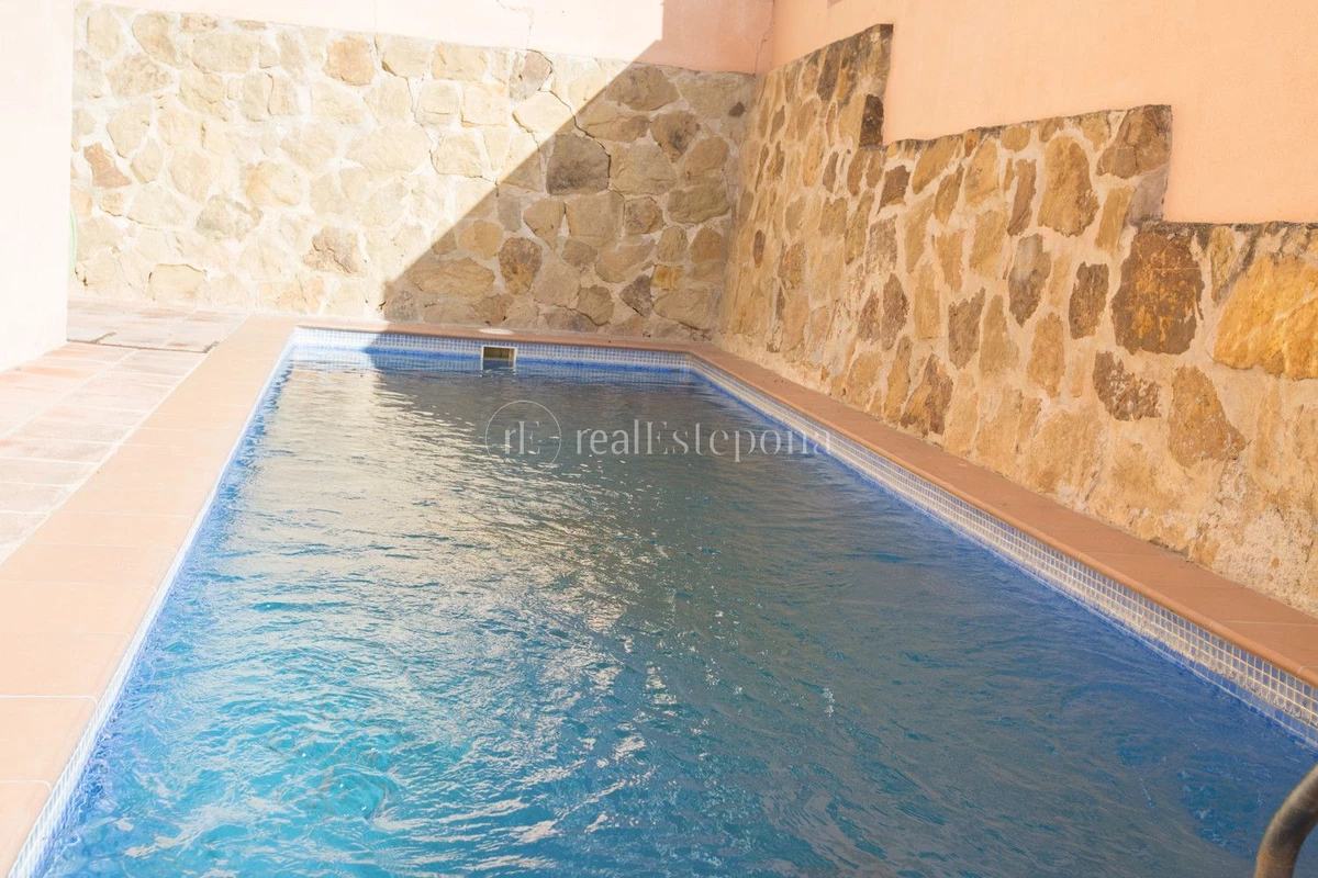 The house is distributed over three levels: a 80 m² basement; the main floor, which includes a kitchen, living-dining room with fireplace, guest toilet, terrace, and private pool measuring 7 x 3 m; and the upper floor with two en-suite bedrooms and a terrace that can be glazed.