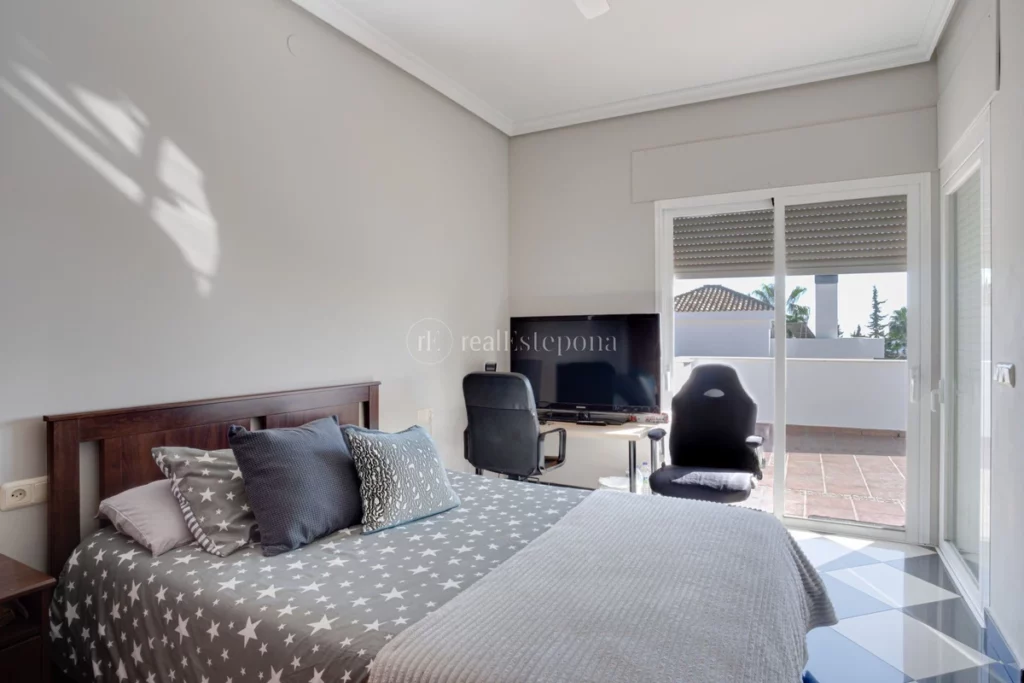 Spacious five-bedroom, south facing villa in the sought-after area of Xarblanca, Marbella. This prime location offers proximity to shops, restaurants, and essential services, while providing a tranquil residential setting. The property boasts a private garden and swimming pool, perfect for relaxation and entertaining. The property has an open-plan living and dining room; fully fitted kitchen and lounge area with access to a spacious terrace and garden; master suite; and a guest toilet on the ground floor. The first floor includes four bedrooms, two bathrooms and a spacious terrace with sea views. The lower level of the property leads to a laundry area, guest toilet and spacious room which could be used as a gym or additional bedroom. Other features include hot and cold air conditioning, solar panels, fitted wardrobes and a spacious driveway. A fantastic opportunity in a highly desirable location.