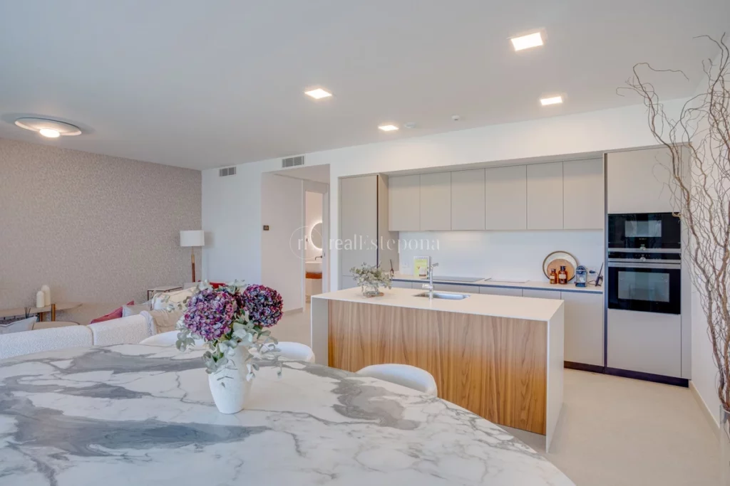 Stunning south-facing ground-floor apartment located in the exclusive Marbella Sunset residential complex in Cabopino. This contemporary home combines modern design with comfort and elegance, featuring a spacious private terrace ideal for relaxing or enjoying outdoor dining under the Mediterranean sunshine.The property offers three bedrooms and three bathrooms. The fully equipped kitchen is finished with high-quality materials and designed for both style and functionality. The bright and spacious living-dining area connects seamlessly with the terrace and outdoor space, creating an inviting indoor–outdoor living experience. Additional features include hot and cold air conditioning and two private parking spaces. The residential complex boasts beautifully landscaped gardens and swimming pools, providing an exclusive and tranquil atmosphere. The area also offers a great selection of nearby amenities, including restaurants, schools, the beach, and golf courses, making this property an ideal option for both permanent living and as a second home.