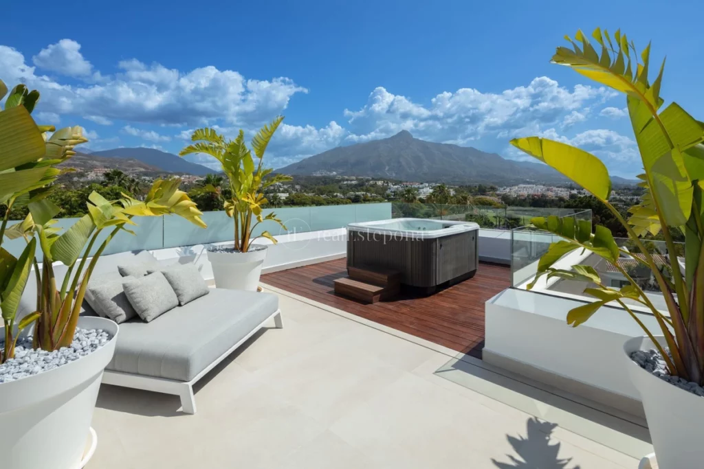 The solarium, complete with a jacuzzi, is ideal for experiencing Marbella’s luxurious lifestyle. The infinity pool overlooks La Concha mountain, offering a refreshing escape during warm summers.