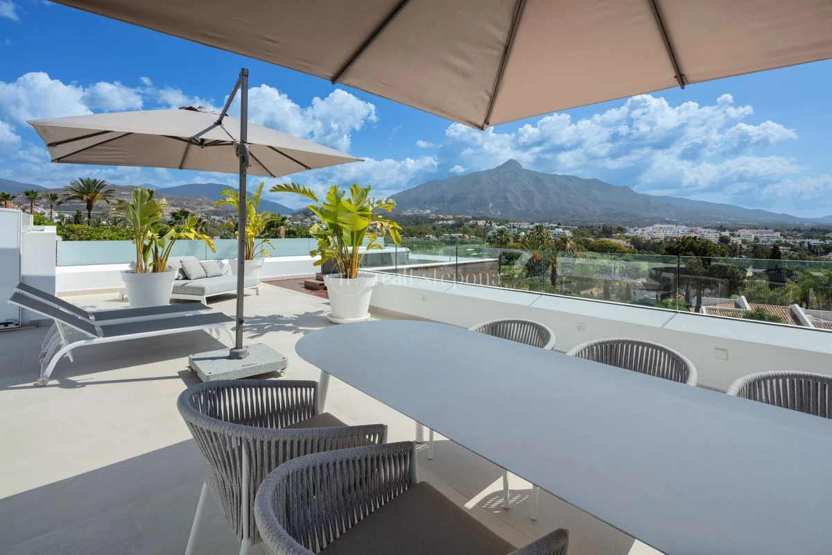 Villa Camellia is a stunning modern villa located in the sought-after Golf Valley of Nueva Andalucía, with views of La Concha and an eastern orientation that allows plenty of sunlight throughout the day.