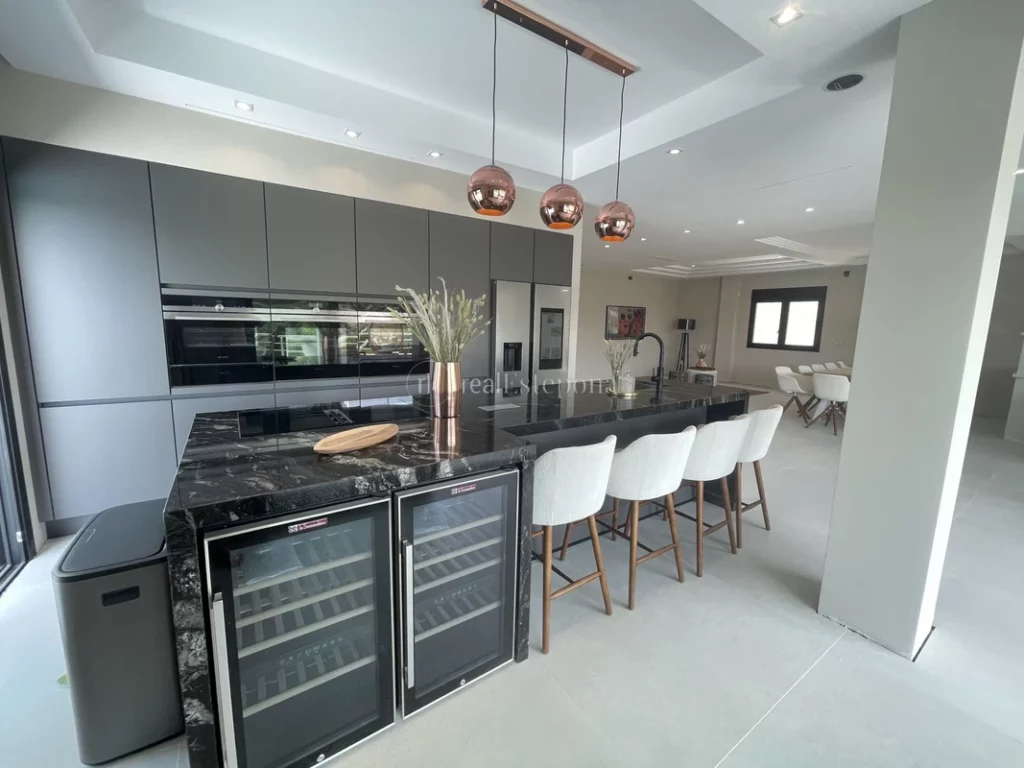 Whatever your age or interests, there’s something here for you to enjoy – whether that be lazing by the pool, strolling around the pretty nearby marina, or teeing off at the local golf course. All the amenities of Marbella and Puerto Banus are within easy reach if you can tear yourself away from the relaxing and calm location of this fabulous home. This stunning villa for sale in Elviria is modern and open plan in design. Set over several levels there is plenty of space for entertaining and for a growing family. It features all the technology you’d expect in a property of this calibre with a home automation system, lift, solar panels, automatic irrigation and electric blinds right though to a cinema room and steam room. This fabulous family home has been recently refurbished to include smart wooden floors, a sleek, fully fitted kitchen and 7 bedrooms and bathrooms.