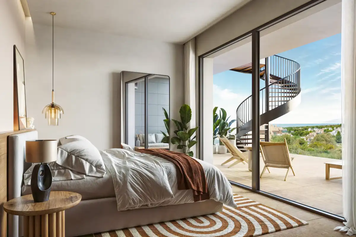 Upper floor: Two elegant bedrooms with en-suite bathrooms, large dressing areas and built-in wardrobes. Each bedroom has a private terrace with panoramic views.