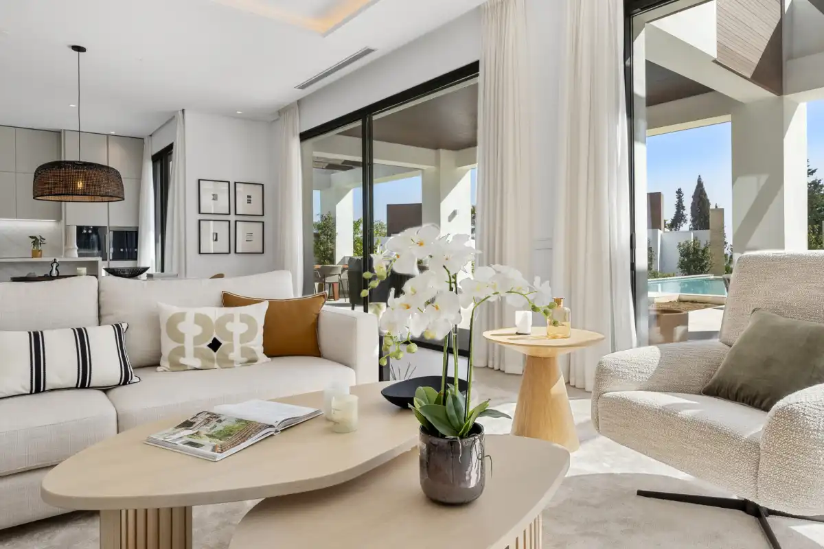 This deluxe modern villa is nestled within a luxury gated community and sits in a leafy enclave on Marbellas Golden Mile.
