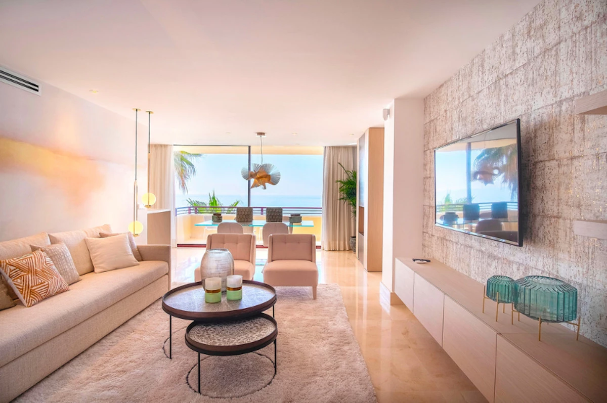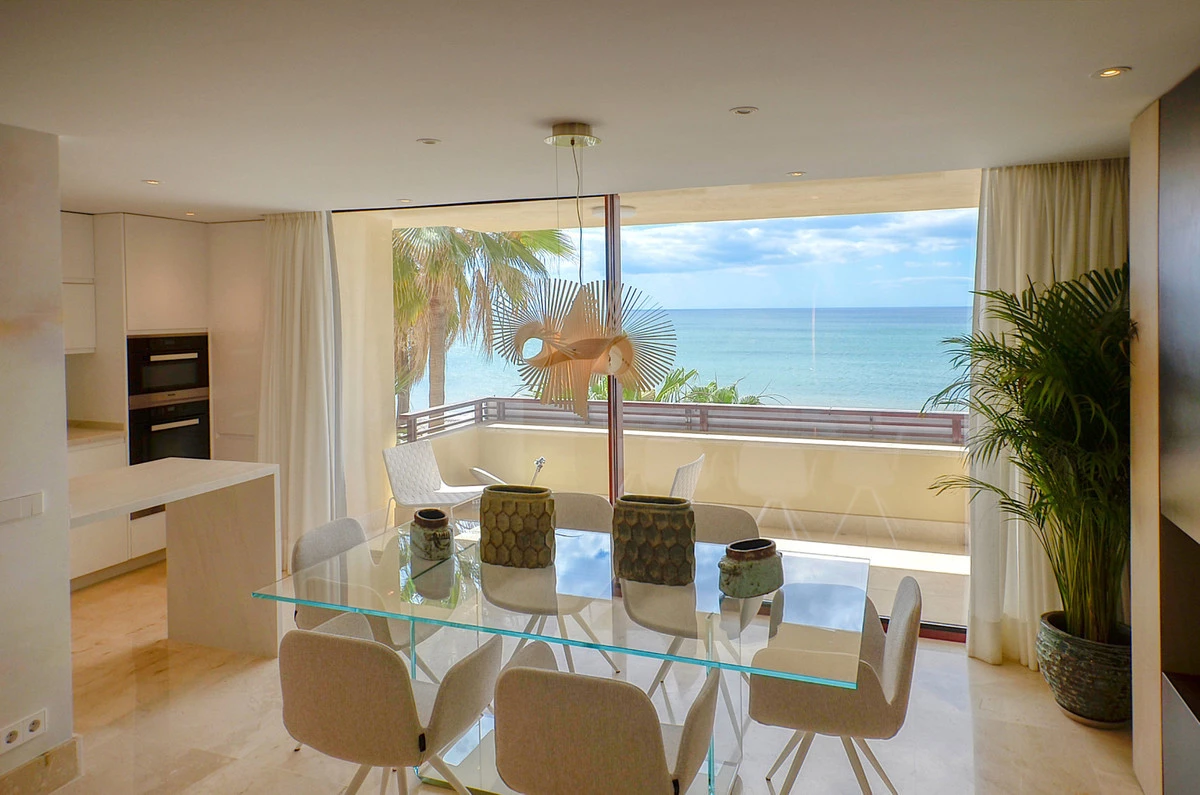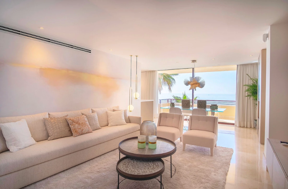 A beautiful two bedroom two bathroom fully renovated apartment situated on the first line of the beach in Estepona town. The location is prefect – as well as the stunning sea views, all the amenities and services of the town are literally on your doorstep. The apartment has been renovated to a very high standard and included is the furniture which has been decorated by one of Marbella's most renowned interior designers. There is a roof top swimming pool, also with stunning views, for those that prefer a pool to the sea. This is definitely a property that needs to be viewed to appreciate the luxurious standards that have been created. A wonderful property with panoramic sea views.