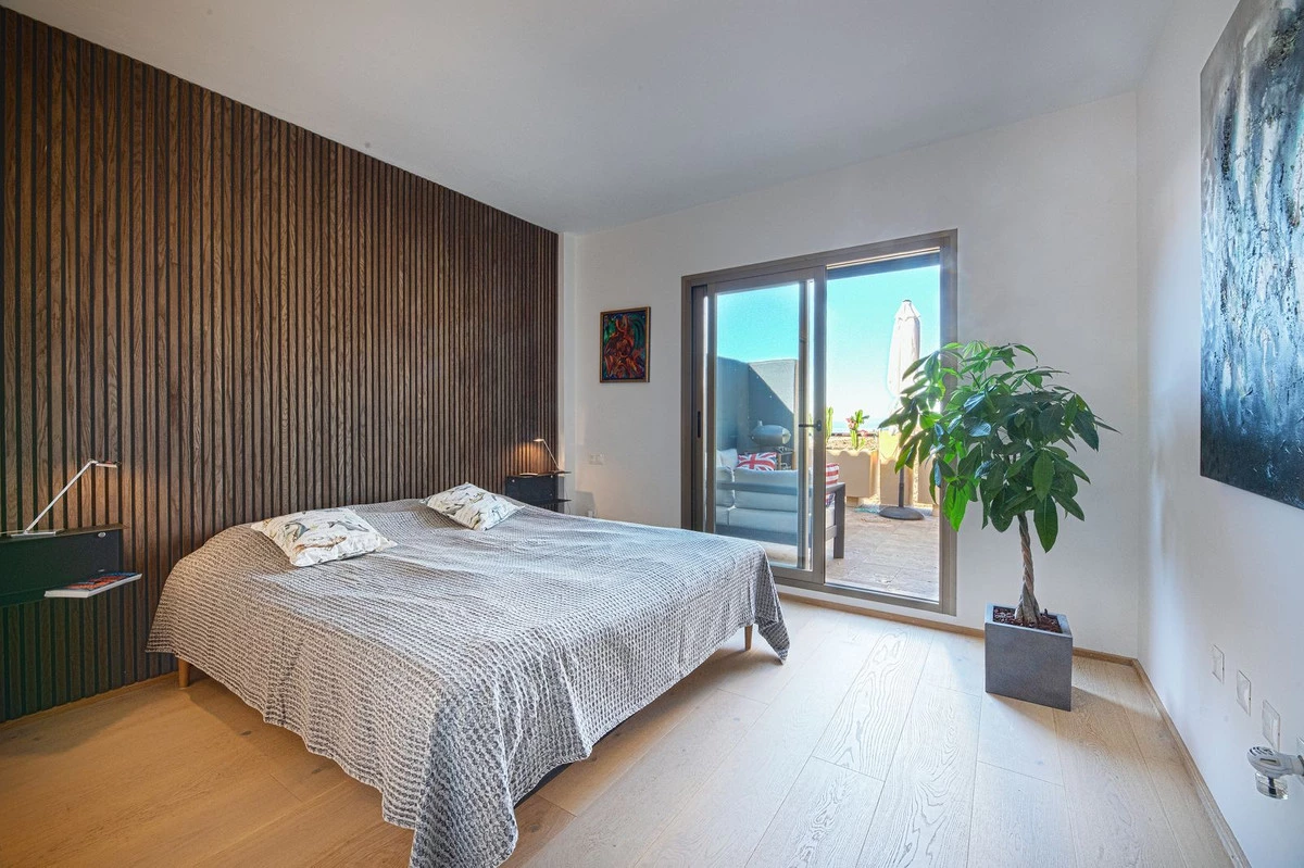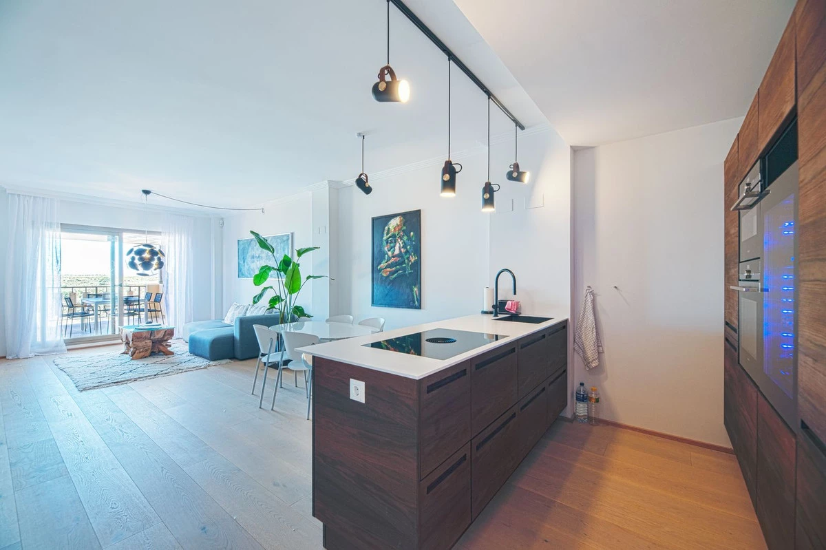 3 bedrooms 2 new bathrooms, new danish carpenter made kitchen with Siemens and Bora top appliances, new oak wood floors, new water pipes, electric curtains, electric blinds in master bedroom, new white doors, underfloor heating in all rooms, A/C, 4 swimming pools 1 heated in winter, 24 hours security, garage and storage room, gym will be established 2023