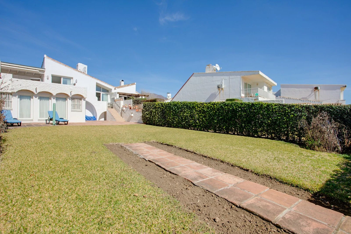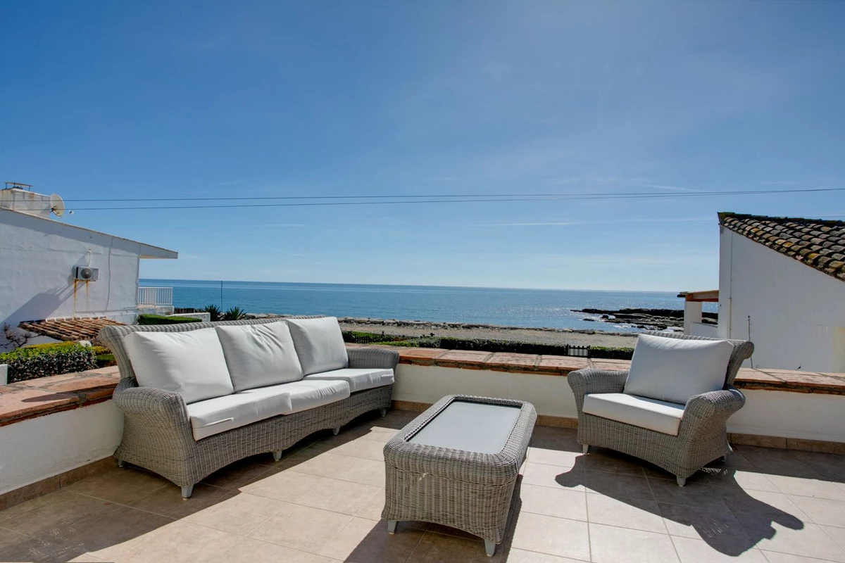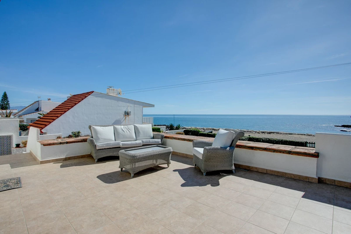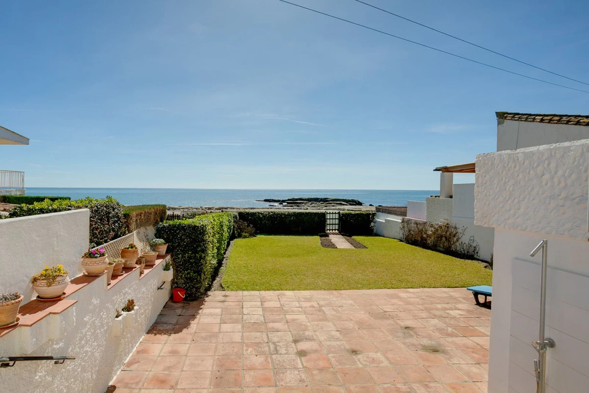 Beachfront villa with large private garden and direct access onto the beach and promenade. Located in the popular development of Bahia Dorada this charming property has 3 bedrooms, 2 bathrooms 2 living areas and open plan kitchen. From the main living area and all the bedrooms you have access to the terraces and garden. The property also has a basement which is excellent storage or small workshop.
