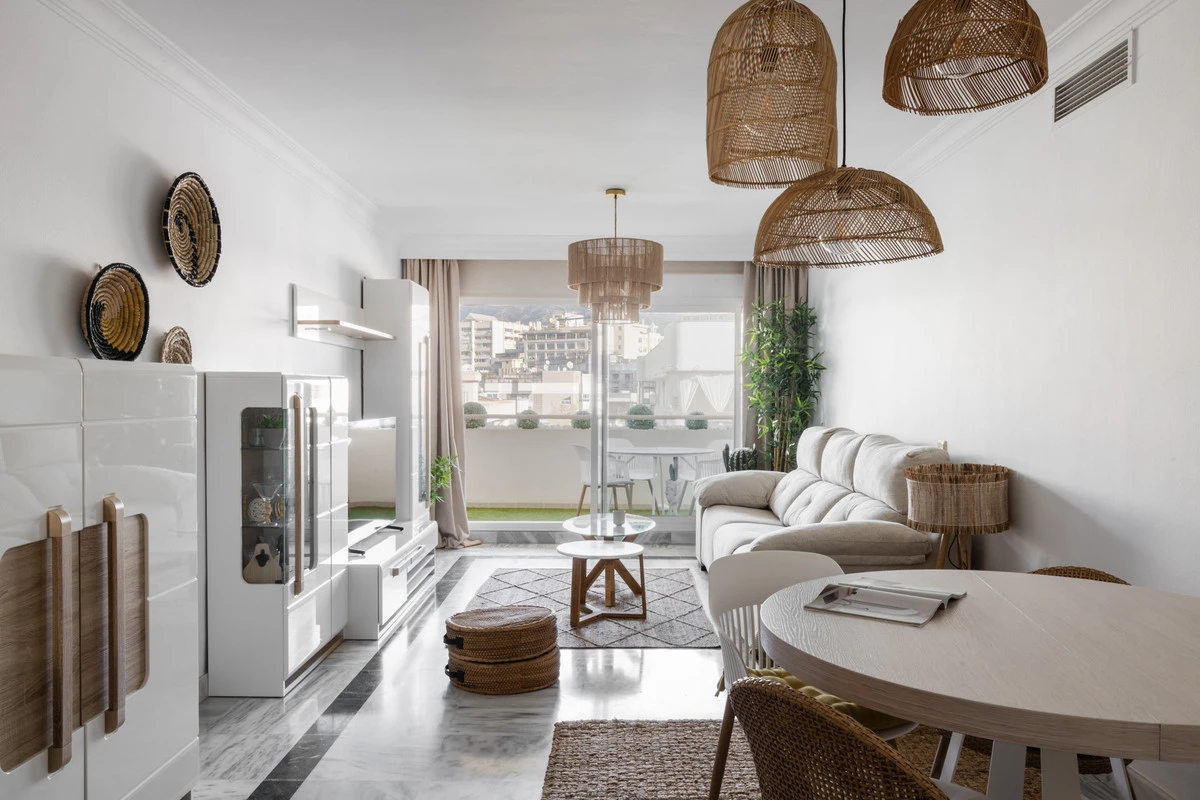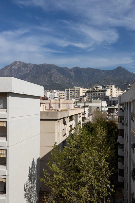 Excellent apartment in second beach line Marbella town. Modern and bright, stylishly decorated with quality brand-new modern furniture. The terrace has 13 sqm and is facing northwest with nice views of the mountain "La Concha". It also has an underground parking space in the building included.