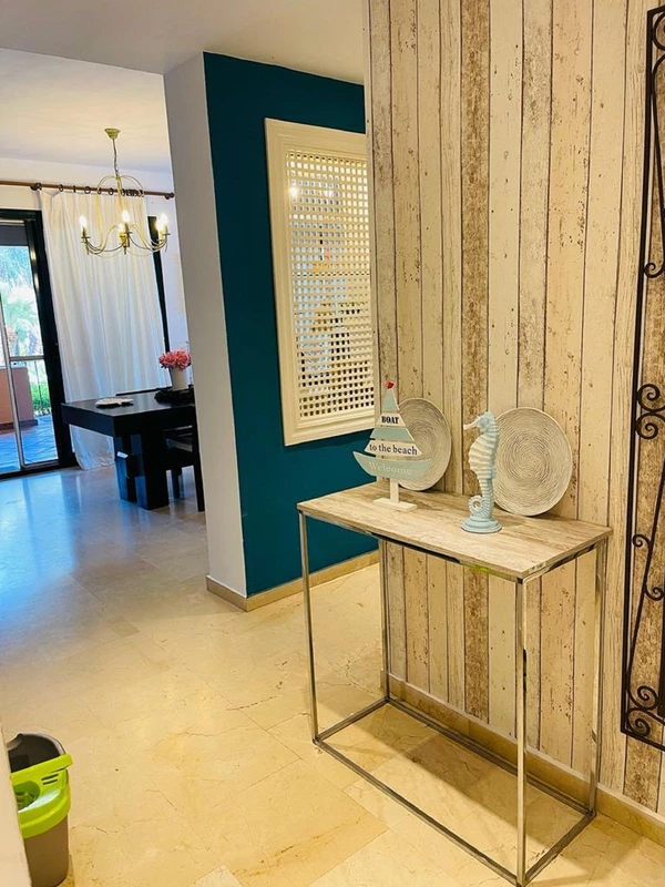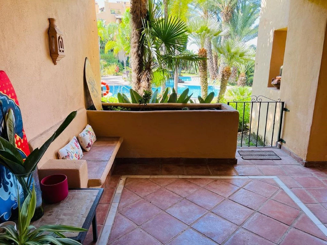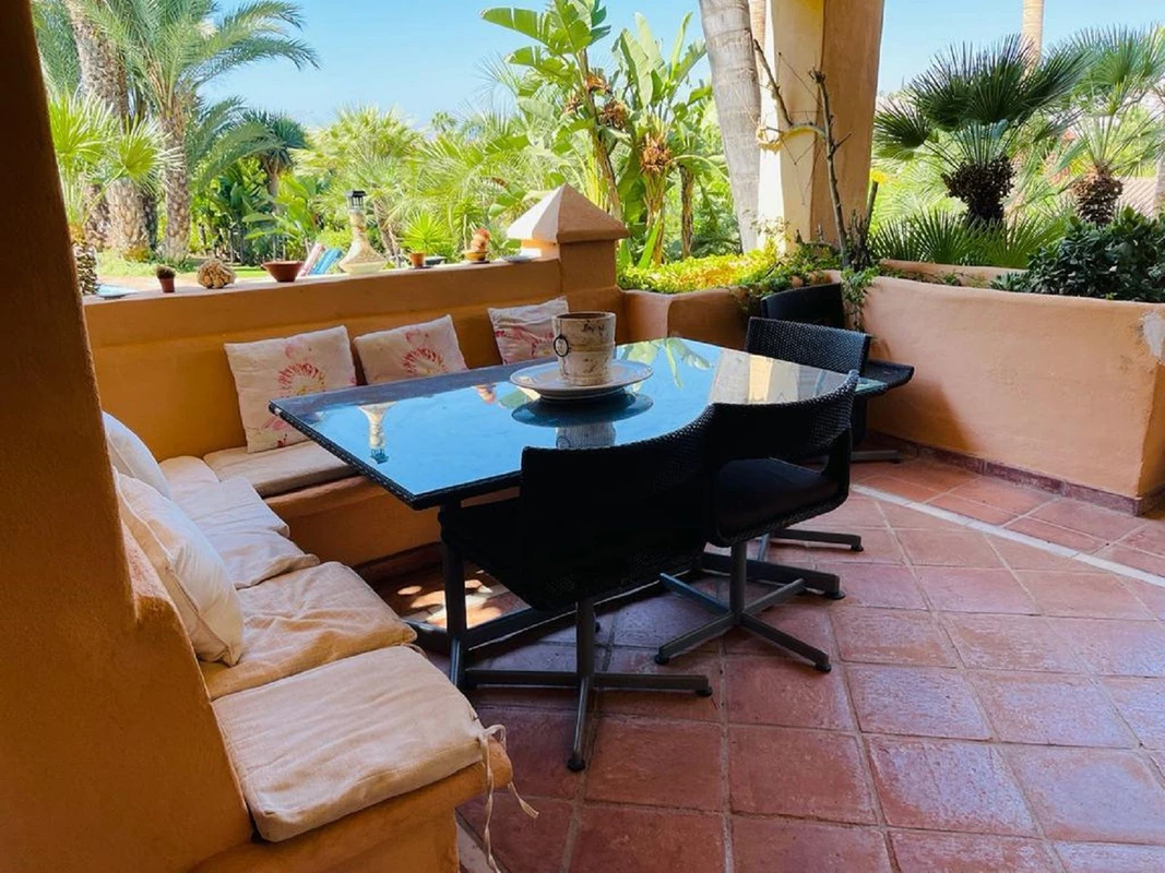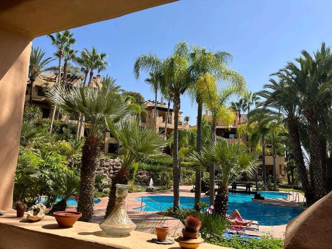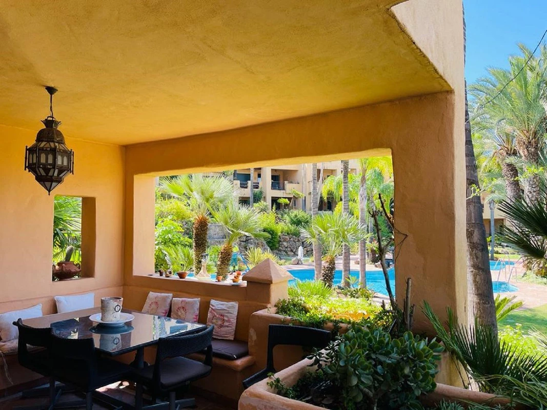 Spectacular ground floor apartment with large terrace, next to the swimming pool in a gated community with 3 swimming pools and communal gardens of 10.000m2 next to Campanario Golf and just 10 minutes from Puerto Banus.