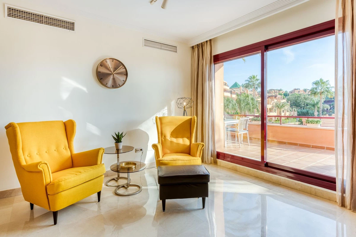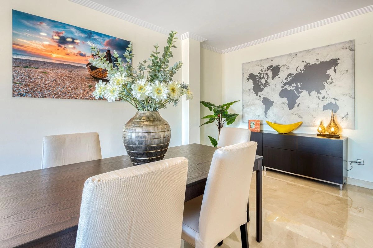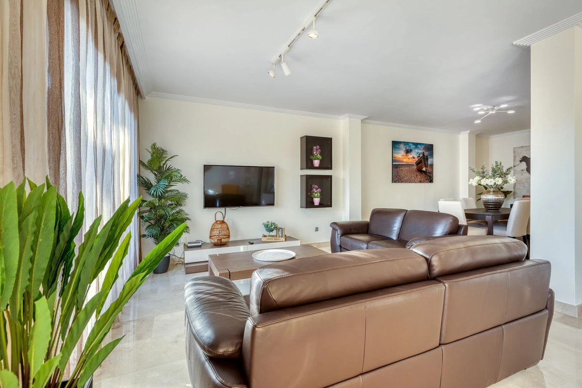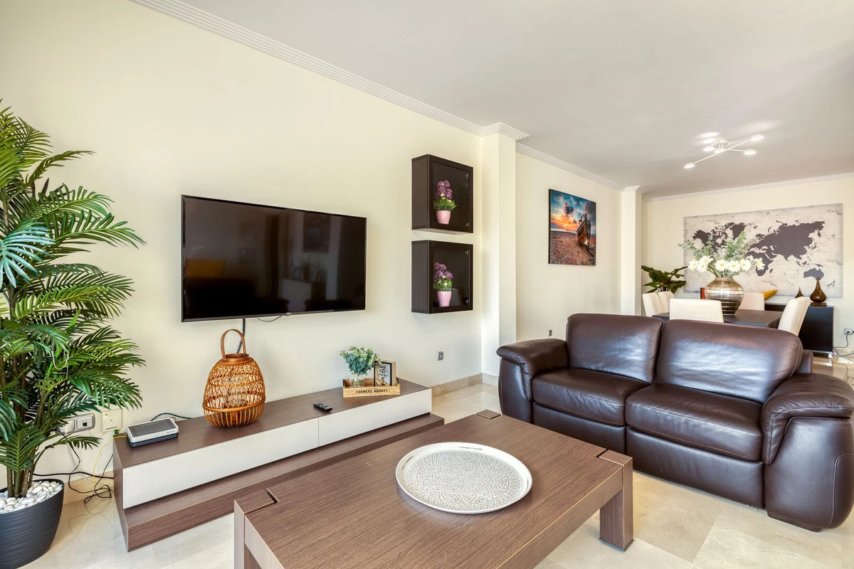 The apartment comprises a spacious living-dining room with access onto a large terrace with views to the communal gardens and the Mediterranean Sea. There is plenty of room for family dining and enjoying the Andalusian sun in all privacy.