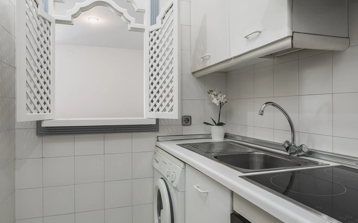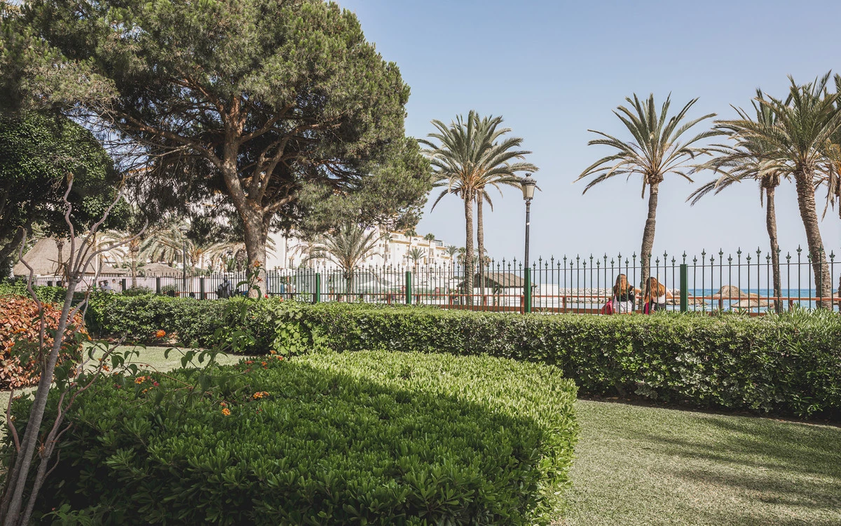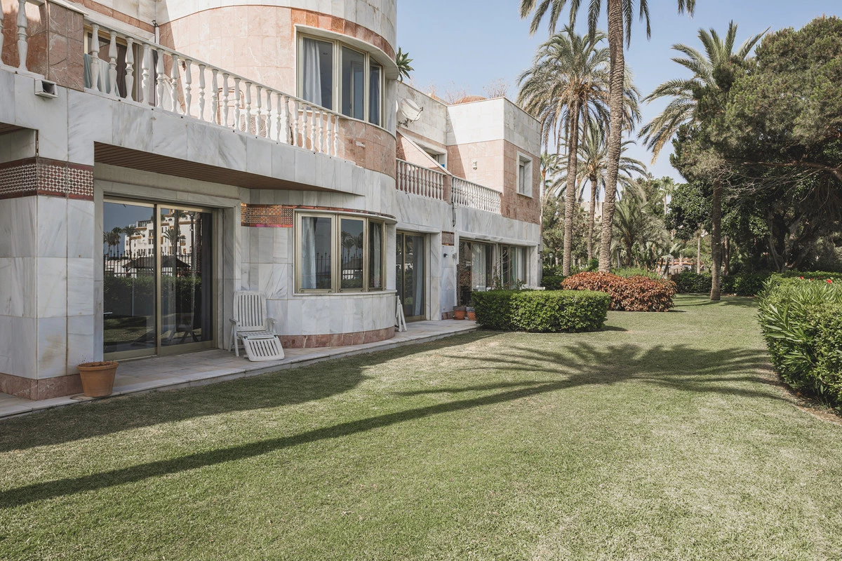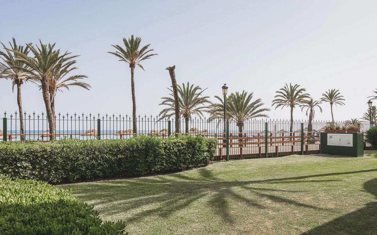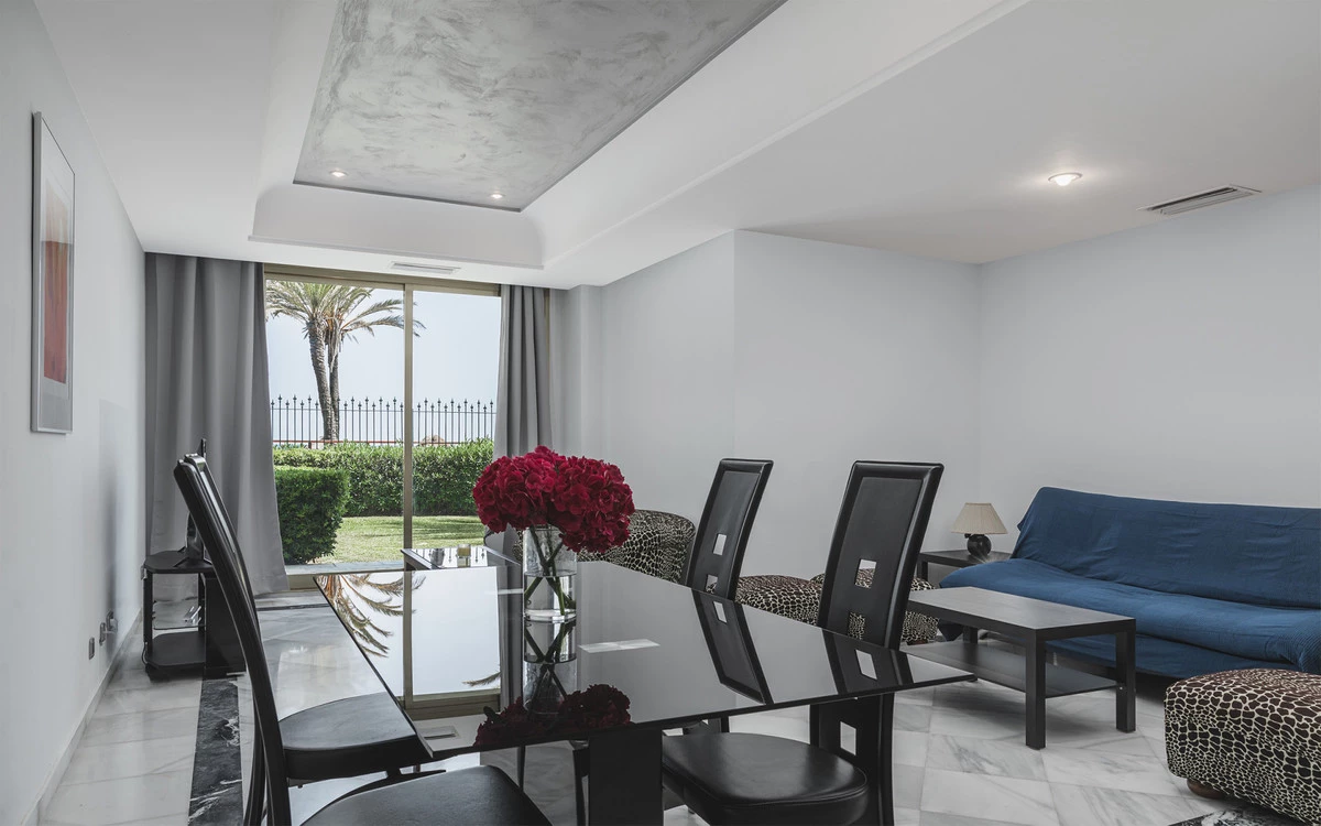 South-facing frontline beach garden apartment located in one of the most sought-after complexes in Puerto Banús, boasting 24-hour security, impeccably maintained communal gardens and two swimming pools. The apartment comprises a large living/dining room with fountain, fully equipped kitchen, access to a terrace leading to the garden and offering sea views, a bedroom and a bathroom. Features: hot and cold air conditioning and marble floors. One of the most prestigious communities in Puerto Banús close to all types of boutiques, restaurants and other amenities.