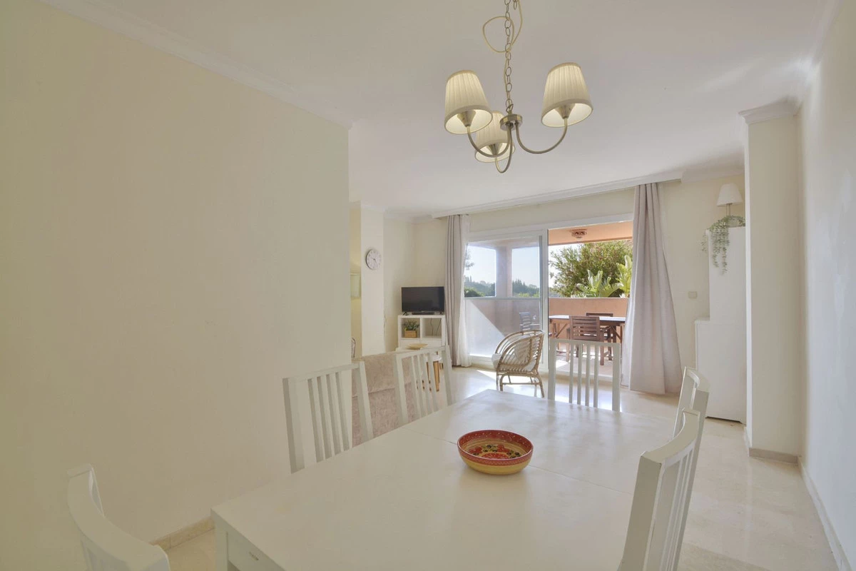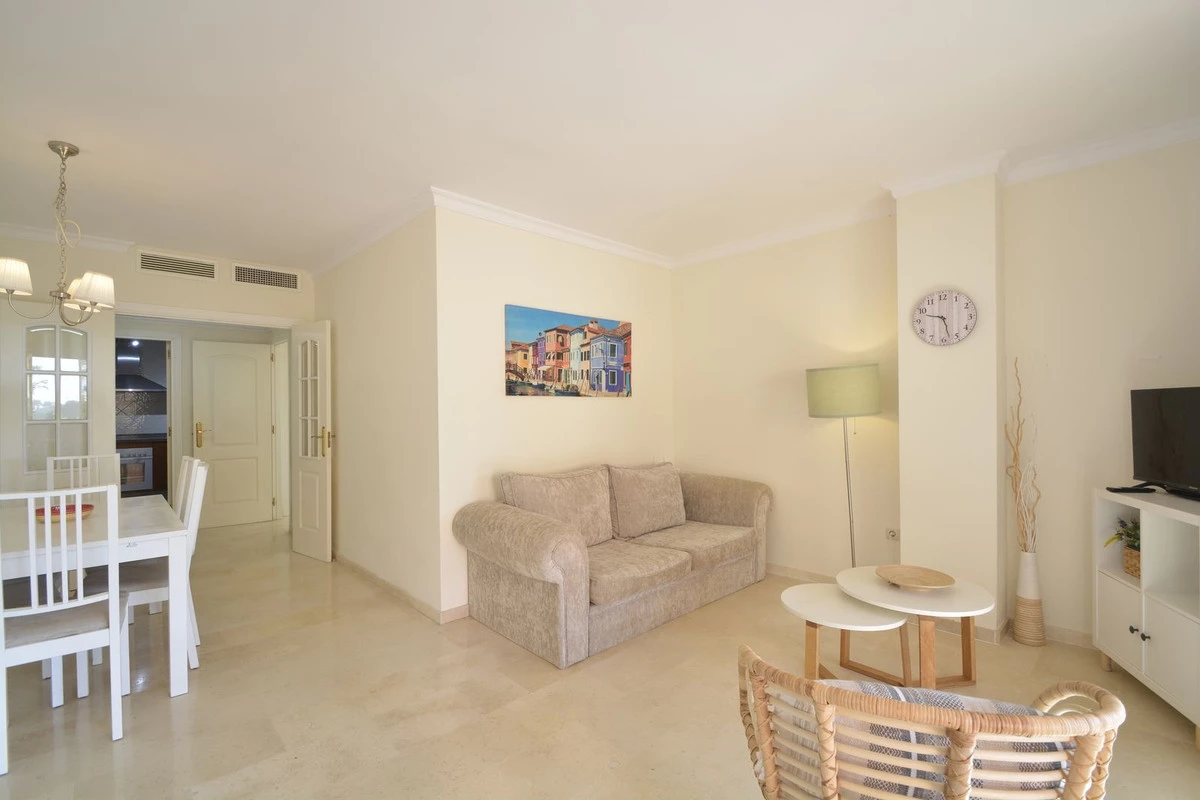 Fantastic luxury apartment in Los Lagos de Santa María Golf-Elviria-Marbella. Gated complex with surveillance cameras located first line of the 18 holes Santa María golf course. This apartment has two bedrooms with built-in wardrobe, one full bedroom with Travertine marble, a bright living room, a fitted and equipped kitchen, a sunny terrace, a parking space and storage room included. Surrounded by well kept tropical garden and several pools for children and adults. Very close to all amenities, since is just 5 minutes from Elviria Shopping center and the best beaches of Marbella. Urbanization with all its infrastructures such as playgrounds, Adventure park, private and public schools, Town Hall, Church, supermarkets, restaurants, banks, etc. Ideal for all families.