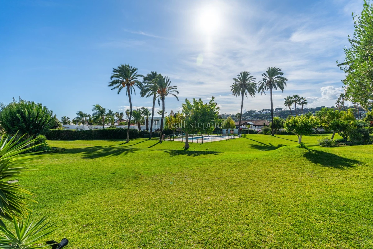 The charming Andalusian-style gated urbanization boasts expansive mature gardens with palm trees, a large swimming pool, and a covered carport parking lot, also gated.