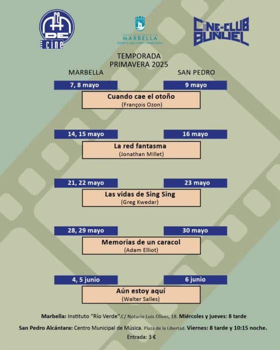 The municipal Culture department’s Cinema Area will screen a dozen films as part of the Spring Season 2025, at IES Río Verde in Marbella and the Municipal Music Center in San Pedro Alcántara. The program will start next Monday, May 5, with ‘Parthenope’ by Paolo Sorrentino. The audience can watch it with subtitles on Monday at 8:00 p.m. in Marbella and on Tuesday at 9:00 p.m. in San Pedro. Other films in the lineup include ‘Queer’ by Luca Guadagnino, ‘The Light We Imagine’ by Payal Kapadia, and ‘Flow, a World to Save’ by Gints Zilbalodis. The season will conclude with ‘Family Only’ by Mike Leigh on June 2 in Marbella and June 3 in San Pedro.